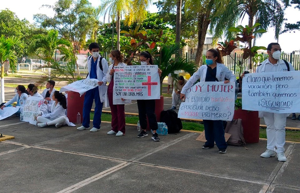 Uniformados de blanco y varios de ellos con pancartas, los jóvenes expresaron que la inconformidad se debe a que no los tomaron en cuenta en la primera etapa para la aplicación de la vacuna que se realizó hace unos días contra la covid-19, y piden que en la segunda fase queden en un grupo prioritario.