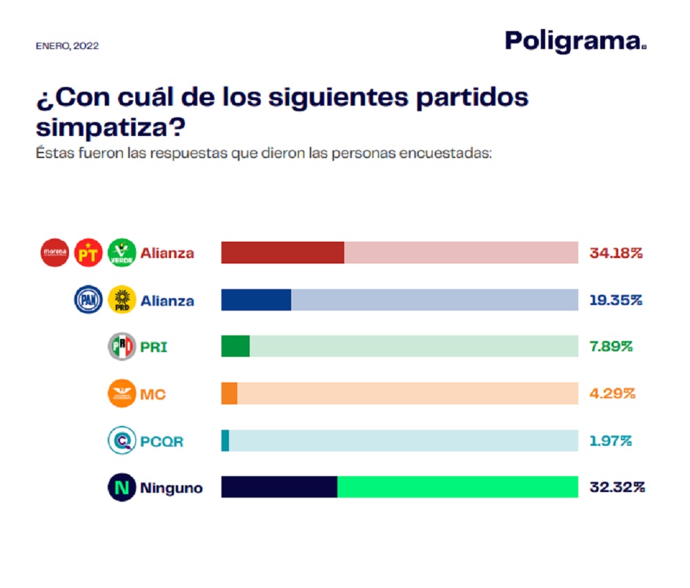 Asimismo, la encuesta efectuada a la comunidad quintanarroense, arrojó que el 34.18% de los simpatizantes se identifica con la alianza “Juntos Hacemos Historia en Quintana Roo”.