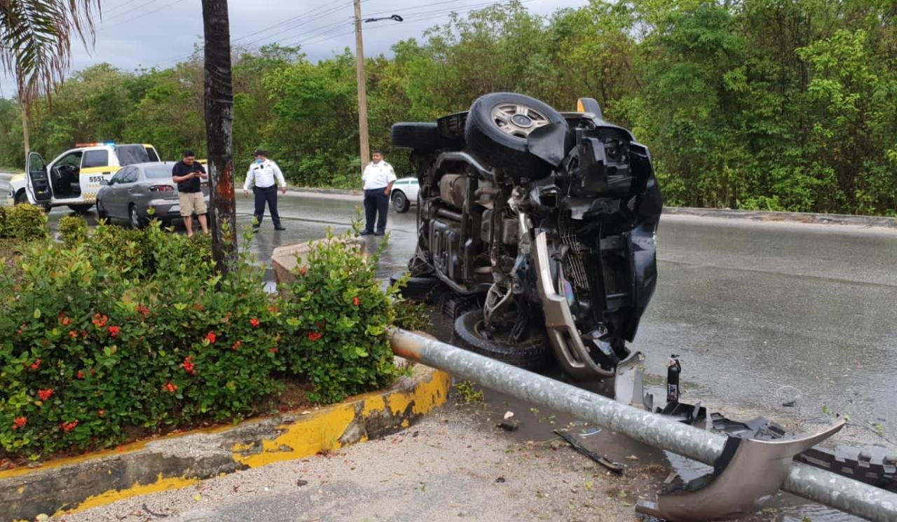 Cancún.- Una camioneta Ford Expedition protagonizó un accidente vehicular esta mañana, luego que terminara volcándose tras perder el control sobre el Arco Vial, a la altura del fraccionamiento La Joya de Cancún.