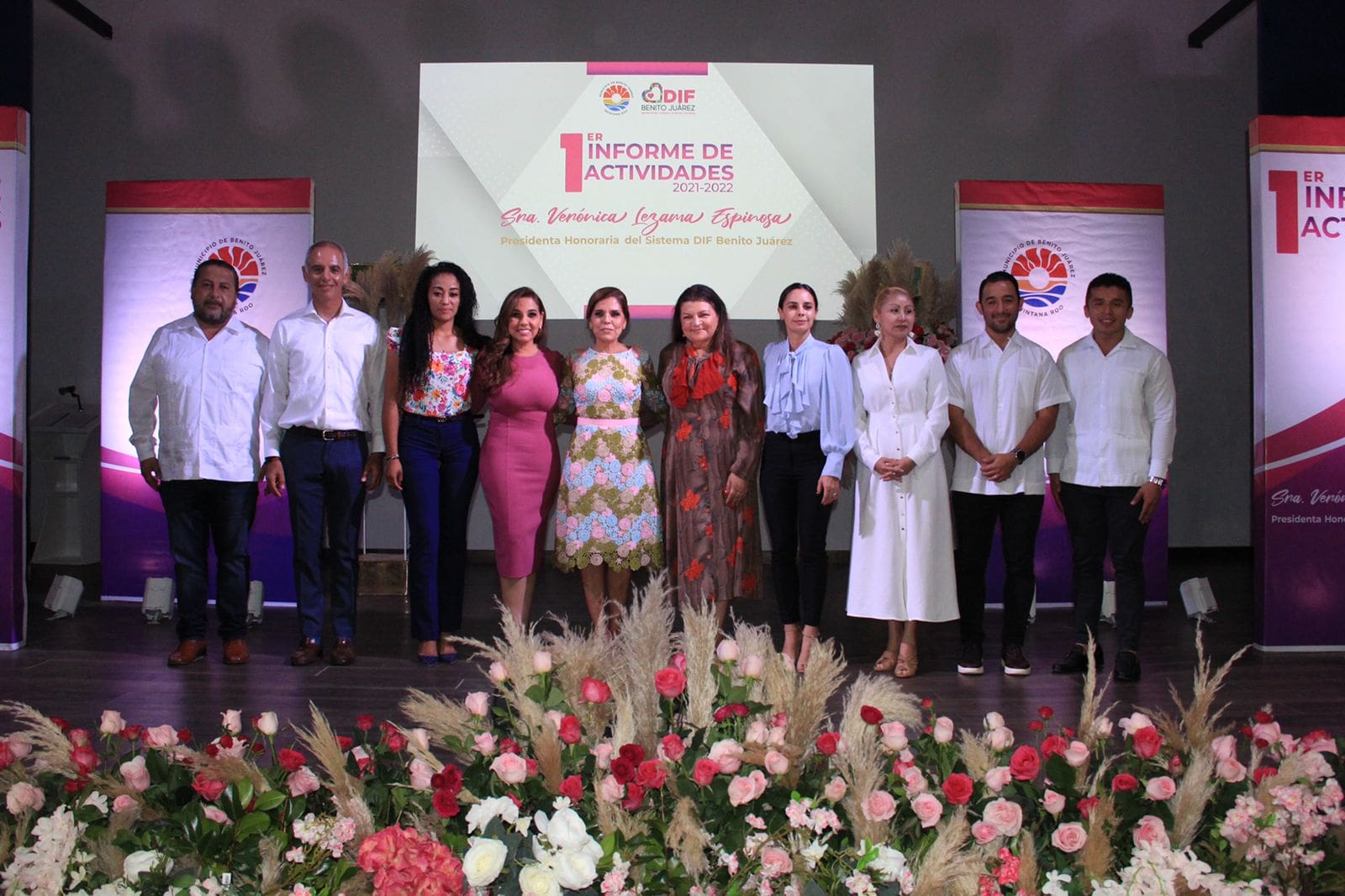 Cancún, Q. R., a 21 de septiembre de 2022.- La presidenta honoraria del Sistema DIF Benito Juárez, Verónica Lezama Espinosa, rindió su primer informe de actividades, en la Universidad TecMilenio, el cual fue atestiguado por la encargada de despacho de la Presidencia Municipal, Lourdes Latife Cardona Muza; la gobernadora electa, Mara Lezama y Ana Patricia Peralta de la Peña.