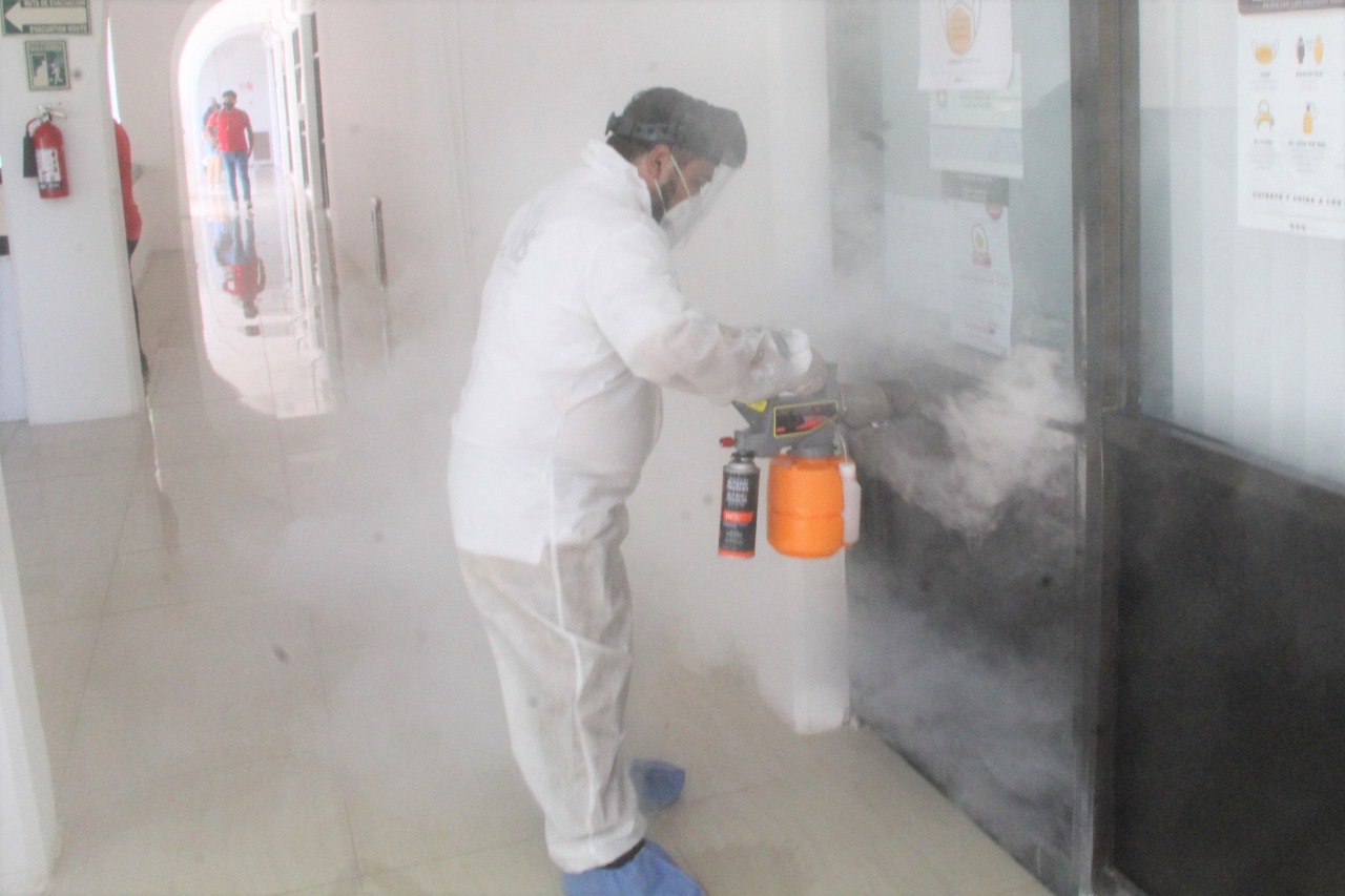 Cancún.- Todas las oficinas del Ayuntamiento de Benito Juárez han comenzado a ser sometidas a un proceso de “blindaje sanitario”, con la aplicación de un virilicida especial, misma que se repetirá cada 30 días por lo menos hasta fin de año, para reducir el riesgo de contagio por COVID-19.