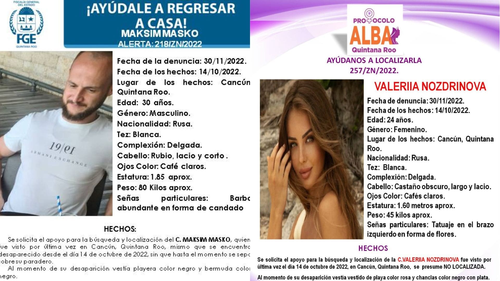 Son Valeriia Nozdrinova, de 24 años de edad y Maksim Masko, de 30, por quienes la Fiscalía de Quintana Roo emitió apenas este miércoles las fichas de búsqueda, al ser reportados como no localizables.