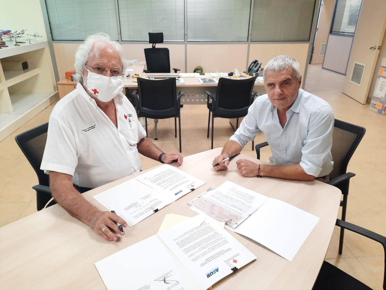 El donativo fue entregado hoy en las oficinas de la Dirección del Aeropuerto de Cancún, contando con la presencia del Delegado Estatal en Quintana Roo y Presidente de la Delegación Cancún de la Cruz Roja Mexicana I. A. P., Carlos Constandse Madrazo y el Director del Aeropuerto de Cancún, Carlos Trueba Coll.