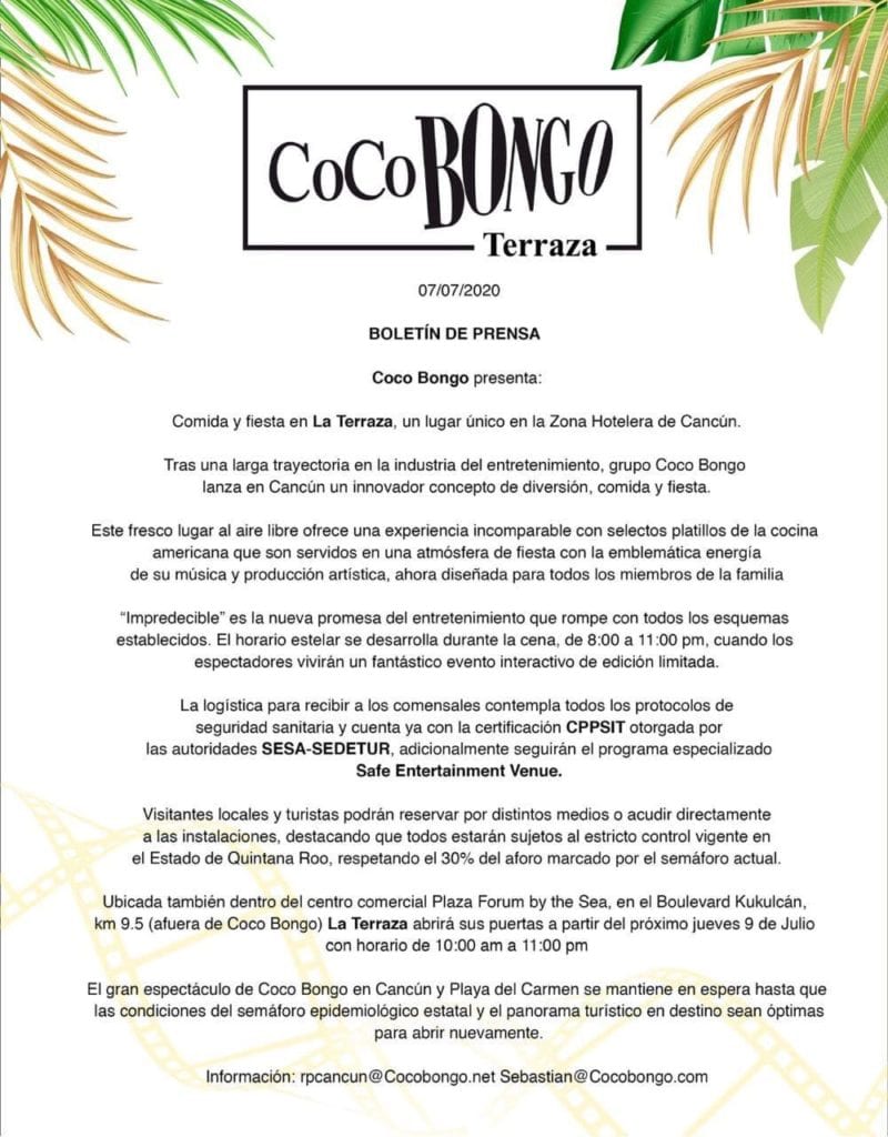 A traves de redes sociales se aclaró que únicamente se abrió la terraza ubicada en Plaza Forum, afuera de Coco Bongo. “Un lugar para comer y divertirse con toda la familia, durante el horario normal de un restaurante de 10:00 am a 11:00 pm”. Y por consecuente se agregó que “hasta el día de hoy Coco Bongo Show en Cancún, Playa del Carmen y Los Cabos permanecen CERRADOS de acuerdo a las indicaciones de las autoridades Municipales y Estatales.” reza el post del usuario en en Facebook de Sebastián de Coco.