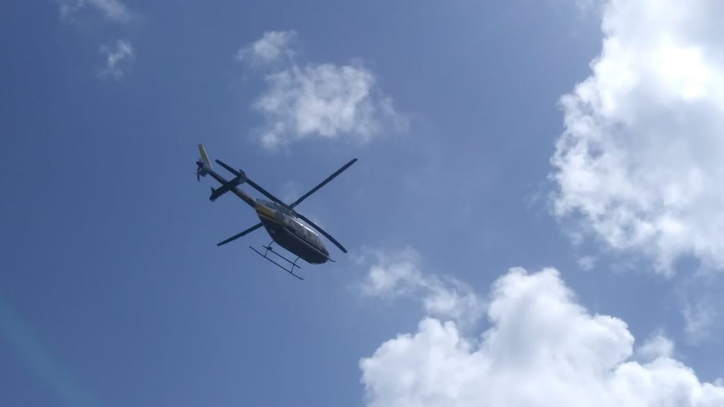 Cancún.- El helicóptero “Águila 1”, propiedad de la Secretaría de Seguridad Pública, sobrevoló esta tarde los alrededores de Tajamar y Malecón Américas, previo a la apertura a vehículos de este espacio.