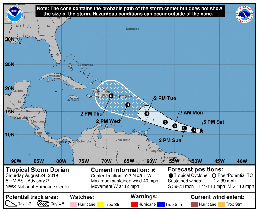 Cancún.- A las 16 horas de ayer, la que fuera depresión tropical 5, que apenas había surgido la mañana del sábado en el Atlántico, evolucionó a la tormenta tropical Dorian, la que todavía se espera que crezca a huracán, pero con una trayectoria que probablemente la lleve hacia República Dominicana.