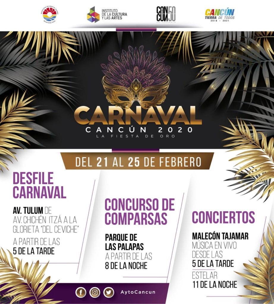 Cancún.- El Ayuntamiento de Benito Juárez, que encabeza la Presidente Municipal de Benito Juárez, Mara Lezama, dio a conocer que la celebración del Carnaval Cancún 2020 “La Fiesta de Oro”, se llevará a cabo del 21 al 25 de febrero, en el Malecón Tajamar, en lugar de Playa Langosta.