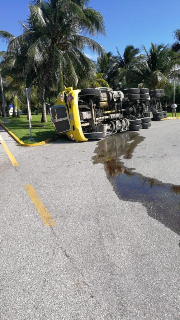 Cancún,Quintana Roo.-Por conducir a exceso de velocidad, un tráiler se volcó en el kilómetro 27 de la zona hotelera, a la altura de la glorieta Fonatur, derramando turbosina sobre la carretera.