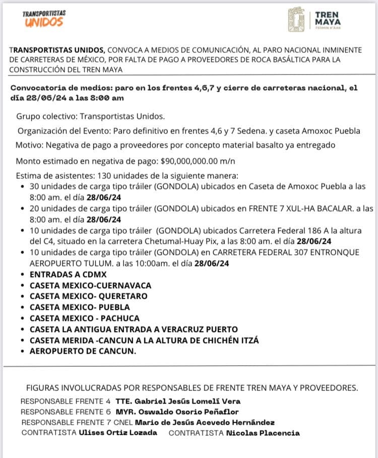 La organización hace un llamado urgente a las autoridades correspondientes para resolver el problema de pagos pendientes y evitar mayores perjuicios tanto a los transportistas como al desarrollo del proyecto del Tren Maya.