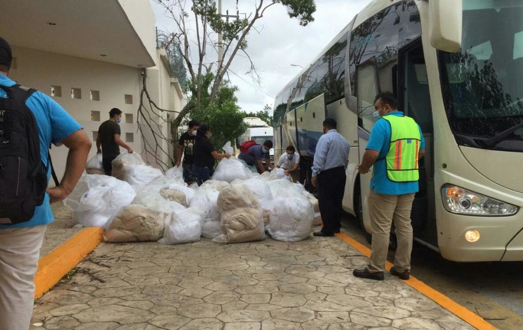 Foto: 120 visitantes que pasaron la noche en el refugio anticiclónico instalado en el colegio Tikal fueron regresados al hotel Hyatt Ziva, auxiliados por personal de este centro de hospedaje, quienes sacaron todos los insumos que les entregaron a sus huéspedes y los llevaron a los autobuses que habían alistado para sus traslado.