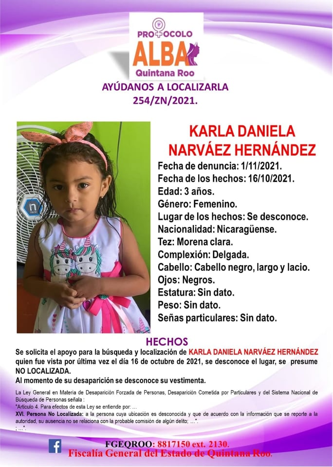 Desaparecidas se encuentran Luisa Carolina Pérez Hernández, de 41 años de edad; Juan Ramón Pérez Hernández, de 24 años de edad; Cristian Vanesa Torres Narváez, de edad desconocida; y Karla Daniela Narváez Hernández, de tres años.