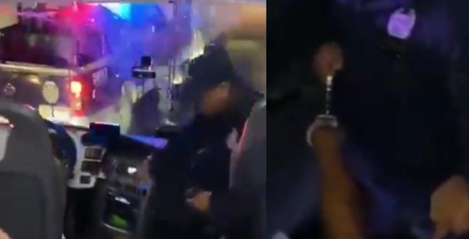 Posteriormente empezaron a forcejear e incluso esposan al chofer, mientras los trabajadores les dicen que está usurpando funciones de Tránsito. Uno de los elementos se pone a gritar e incluso exige a los ciudadanos que se callen, quienes les advierten que está siendo grabado.