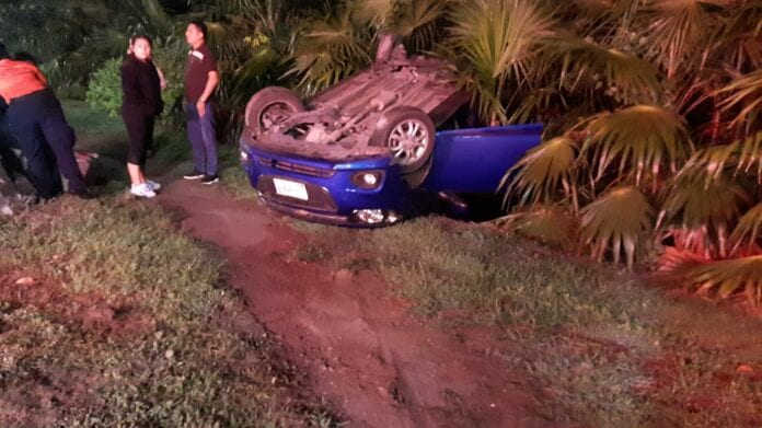 Playa del Carmen.- Una familia sufrió una volcadura durante la madrugada cuando iba a bordo de un vehículo compacto sobre el bulevar con arco vial, lado norte.