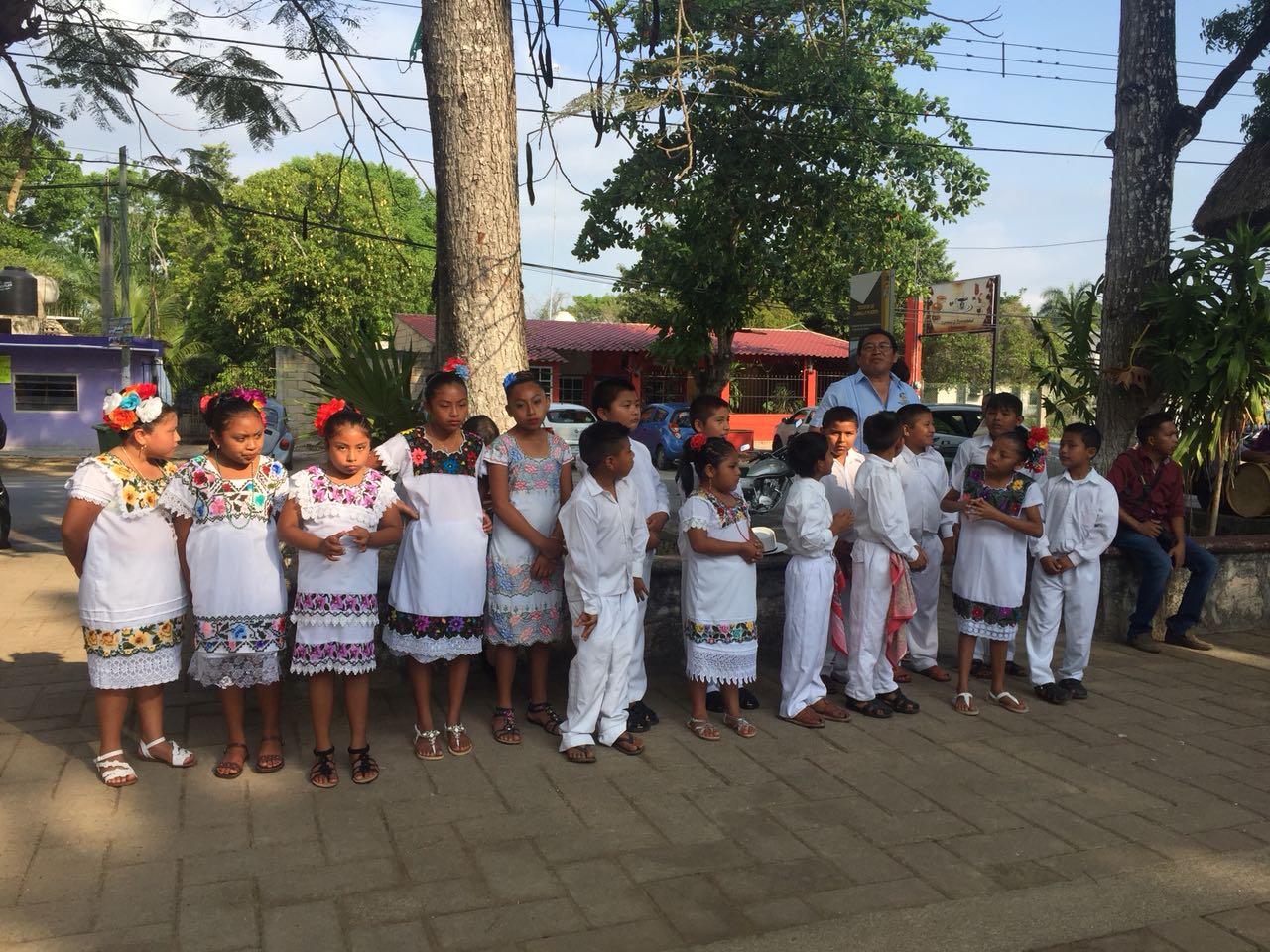 Portando la vestimenta tradicional, los pequeños, provenientes ocho escuelas primarias de las comunidades de Felipe Berriozabal, San Ramón, Tac-Chivo, Kancepchen, Francisco May y X Trapich participaron en el primer concurso de entonación de los himnos a Quintana Roo y Nacional Mexicano en lengua maya.