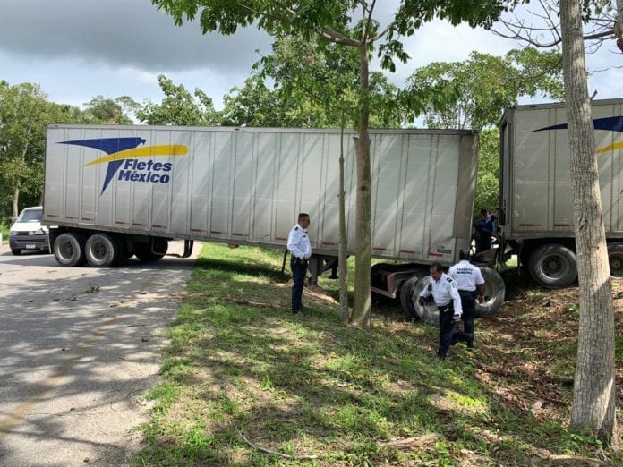 Playa del Carmen.- La lluvia, el tráfico pesado y el cansancio parecen ser las causas por las cuales el conductor de un trailer con remolque tuvo que maniobrar bruscamente, hasta quedar atravesado entre ambos carriles sobre la carretera federal 307, en el tramo conocido como Boulevard Playa del Carmen.