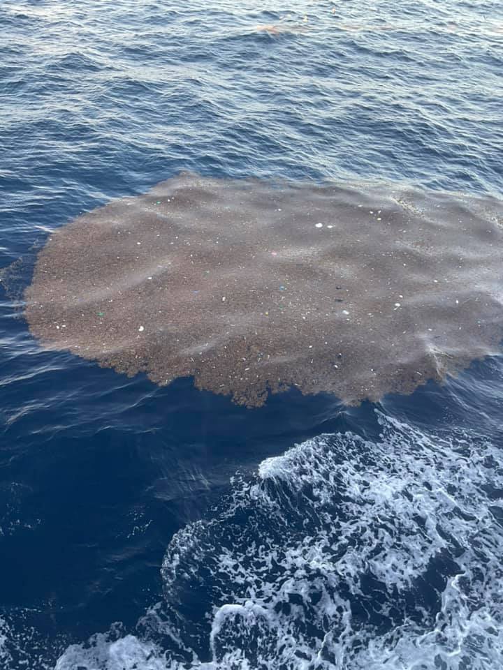 Cozumel, Quintana Roo.– Costras de basura fueron captadas flotando entre Cozumel y Playa del Carmen por una organización no gubernamental que asegura, que este mal se une al sargazo para afectar las costas.