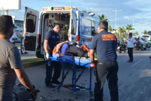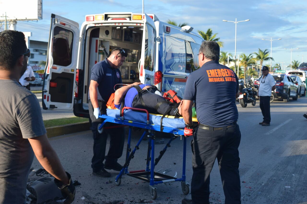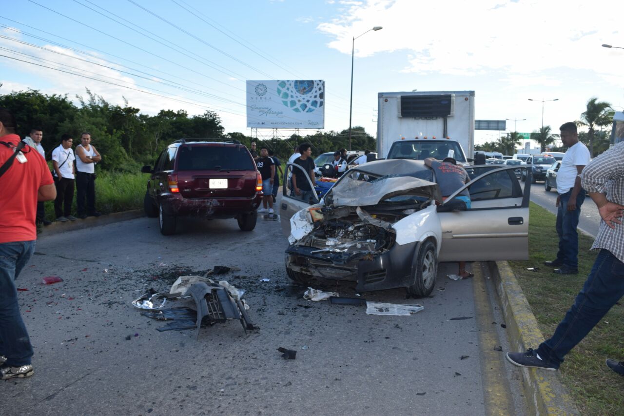 Cancún.- Una mujer quedó atrapada entre los fierros de su vehículo, después de que ocurriera una carambola entre cuatro vehículos en el bulevar Luis Donaldo Colosio, a 100 metros del distribuidor vial.