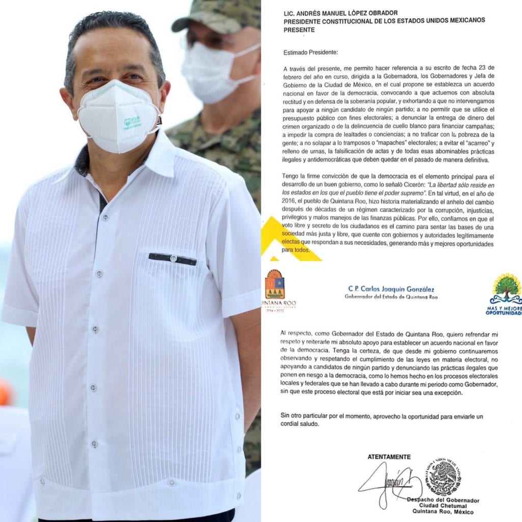 Por ello, en su calidad de Ejecutivo estatal, el gobernador de Quintana Roo se suma al “Acuerdo Nacional por la Democracia”, garantizando que en Quintana Roo se respetarán las leyes en materia electoral, no se apoyará a candidatos de ningún partido y se denunciarán las prácticas legales que pongan en riesgo a la democracia.