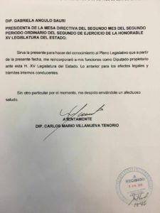 Sin embargo, y probablemente como resultado de la aparente ruptura entre estas dos fuerzas políticas, Villanueva Tenorio no será registrado ante la autoridad electoral, como sí lo será Hernán Pastrana, motivo por el que ya entregó un oficio dirigido a Gabriela Angulo Sauri, presidenta de la mesa directiva, para notificarla que regresa a sus funciones.
