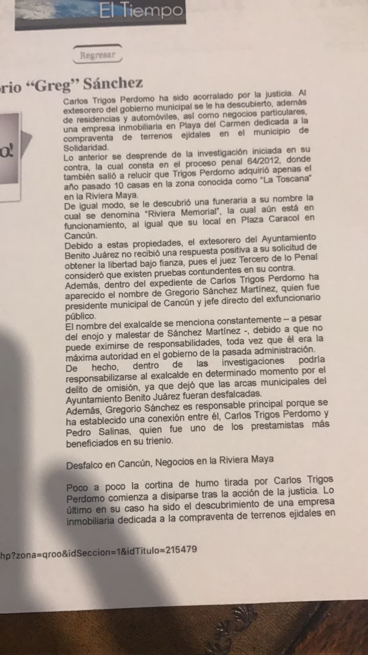 Como mencionamos líneas anteriores, Carlos Mimenza formaba parte de la corrupción. Fue socio del ex tesorero de Benito Juárez Carlos Trigos Perdomo, quien fue encarcelado por el delito de peculado por más de 87 millones de pesos en el año 2012, como publicó en su momento el diario Por Esto.