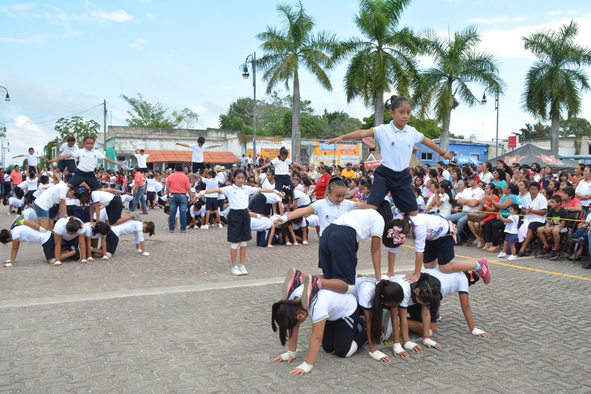 Le siguieron el paso las escuelas primarias y secundarias, quienes destacaron por sus pirámides humanas y sus vistosas tablas rítmicas que presentaron números musicales portando atuendos tricolores así como caracterizaciones de personajes de la Revolución Mexicana.