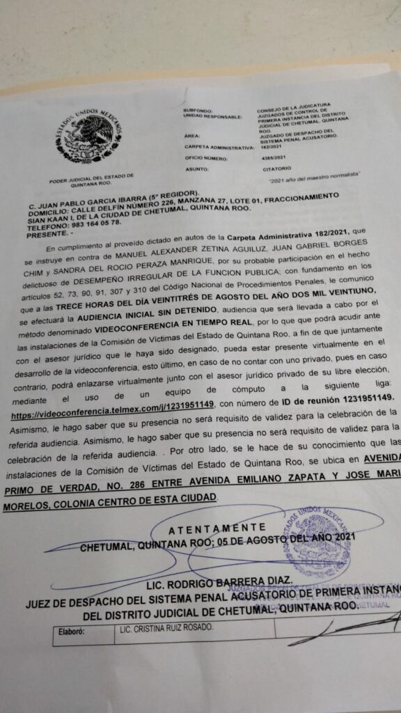 Citados a declaran están los regidores que no declararon a favor en su momento porque no eran parte del Cabildo, hablamos del 5to regidor y de Juanita quien llego hace 2 meses a la regiduría tras la candidatura de Trinidad Guillén.