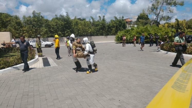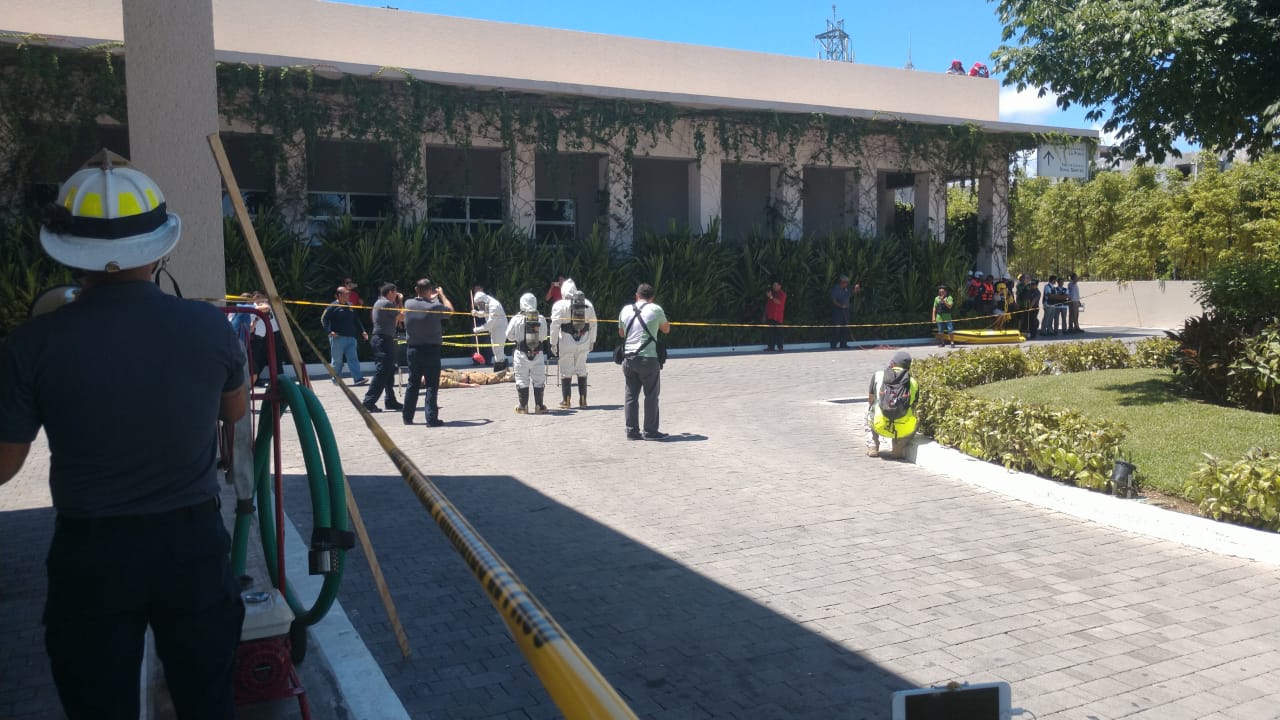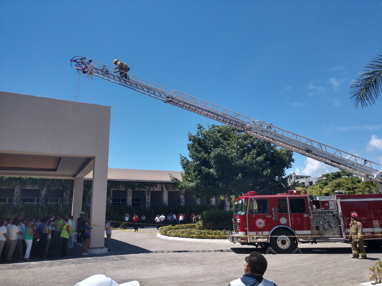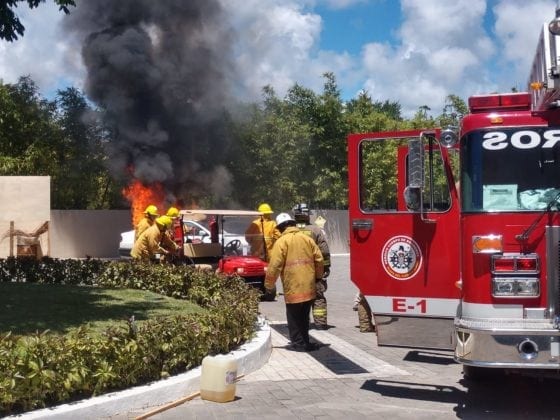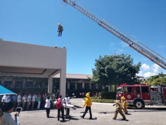 Los participantes de la Academia de Bomberos y personal del Hotel Paradisus llevó a cabo un simulacro de incendio de autos y estructuras, así como el rescate de personas atrapadas en alturas, en el que se utilizó el carro bomba con escalera de 30 metros, la ambulancia, equipos y trajes especiales de la Dirección de Bomberos.