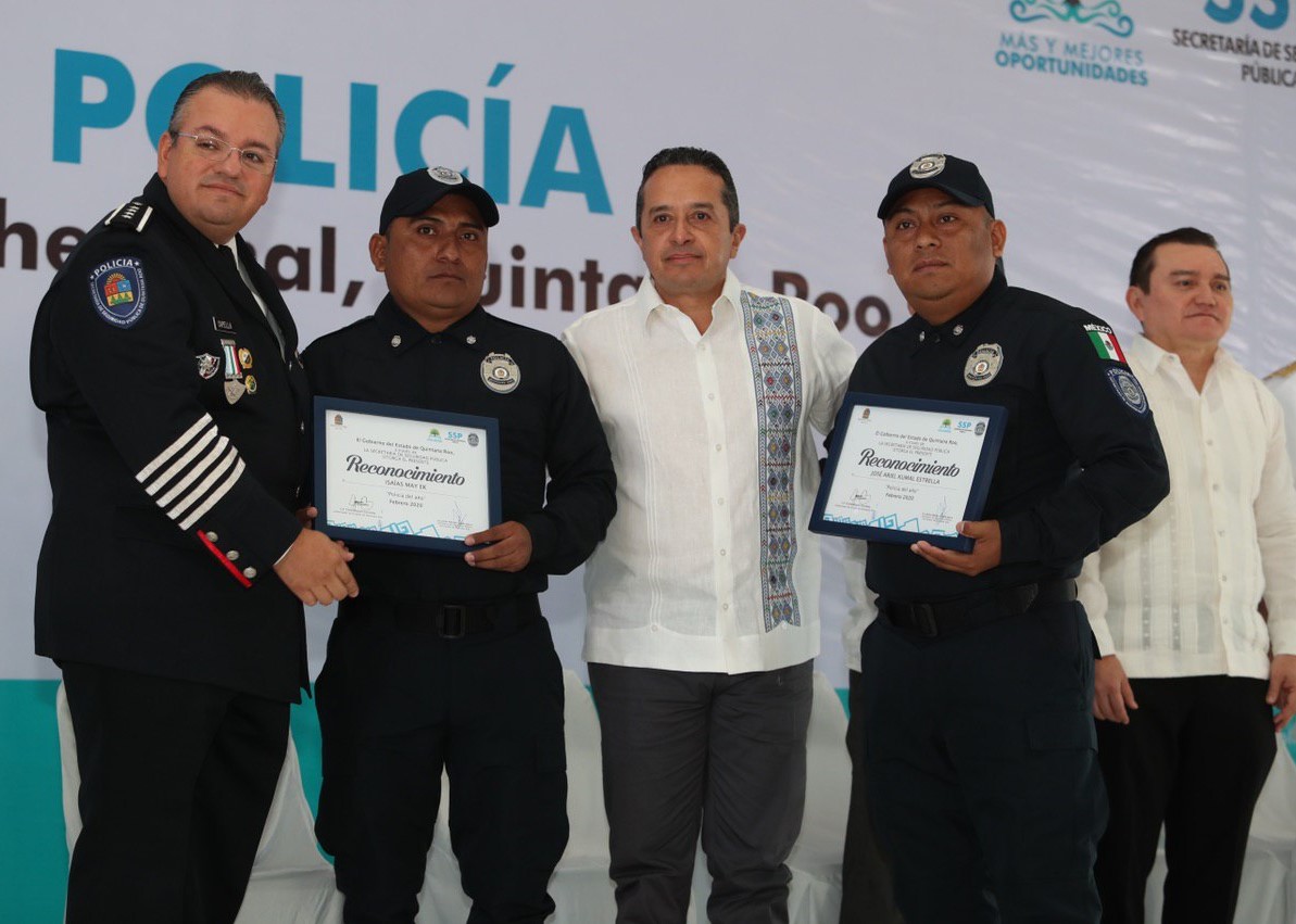 Carlos Joaquín entregó los reconocimientos de “Policías del Año” a los elementos de la policía estatal José Ariel Kumal Estrella e Isaías May Ek por el desempeño de sus funciones con honradez, valentía, respeto y responsabilidad en el trabajo realizado durante el año pasado.