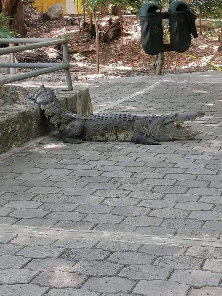 Esta mañana, fue reportada la presencia del cocodrilo fuera de su estanque lo que llevó a las autoridades correspondientes a activar el protocolo para su rescate y reubicación, a fin de evitar que este reptil sea un peligro para la población que acude a diario a realizar actividades físicas y recreativas en el lugar.