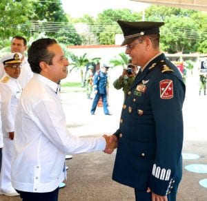 Chetumal.- El gobernador de Quintana Roo Carlos Joaquín González asistió a la ceremonia de Toma de Posesión y Protesta de Bandera del general brigadier DEM José Luis Vázquez Araiza como nuevo comandante de la 34ª Zona Militar, en la explanada del 7º Regimiento de Caballería Motorizado.