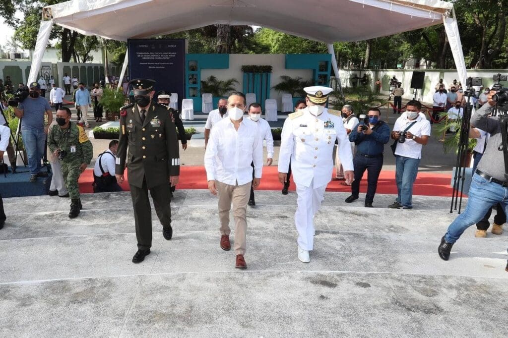 El Gobernador estuvo acompañado del anfitrión de la ceremonia, General José Luis Vázquez Araiza, comandante de la Trigésima Cuarta Zona Militar; el Vicealmirante José Ricardo Gómez Meillón, comandante de la Décimo Primera Zona Naval; el Lic. José Antonio León Ruiz, presidente del Tribunal Superior de Justicia; el Diputado del Congreso del Estado, Lic. Roberto Erales Jiménez; el Comisario, Francisco Justo Toscano Camacho, Coordinador Estatal de la Guardia Nacional en Quintana Roo; y el presidente Municipal de Othón P. Blanco, Otoniel Segovia Martínez.