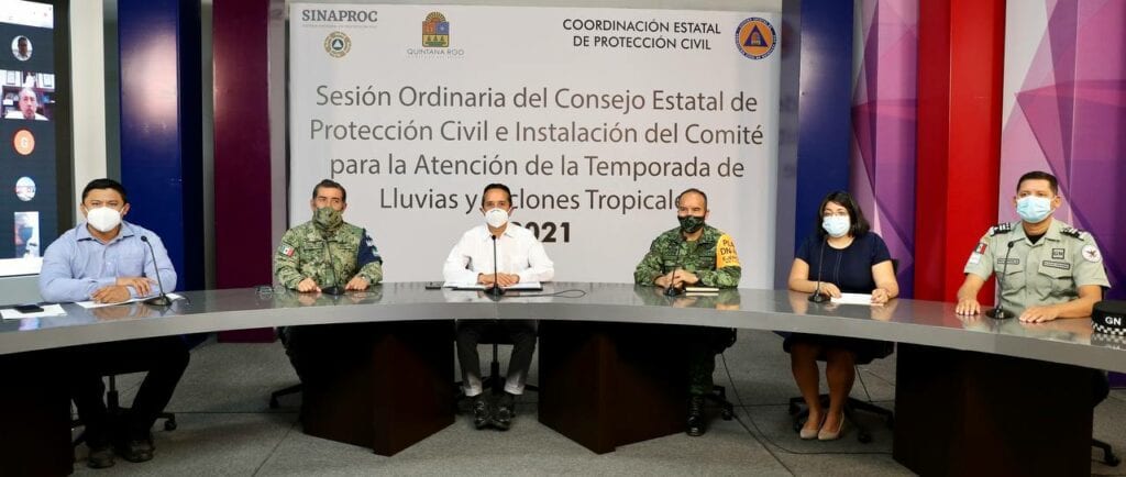 Chetumal.- El gobernador Carlos Joaquín presidió la sesión ordinaria del Consejo Estatal de Protección Civil e instaló el Comité Operativo para la Atención de la Temporada de Lluvias y Ciclones Tropicales 2021.