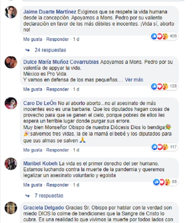 La mayoría de los comentarios son a favor de las declaraciones del Obispo Pedro Pablo Elizondo y sus declaraciones pro vida, ya que ellos también están a favor de defender la vida.