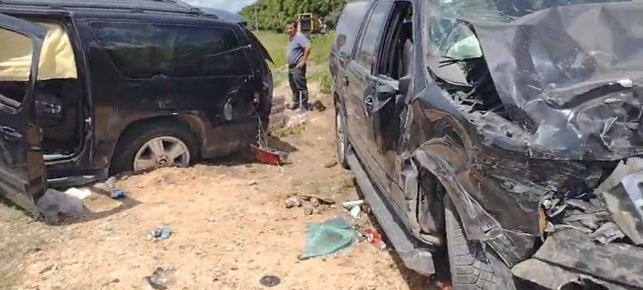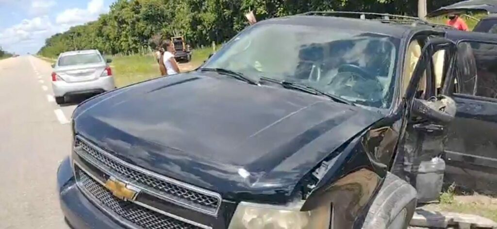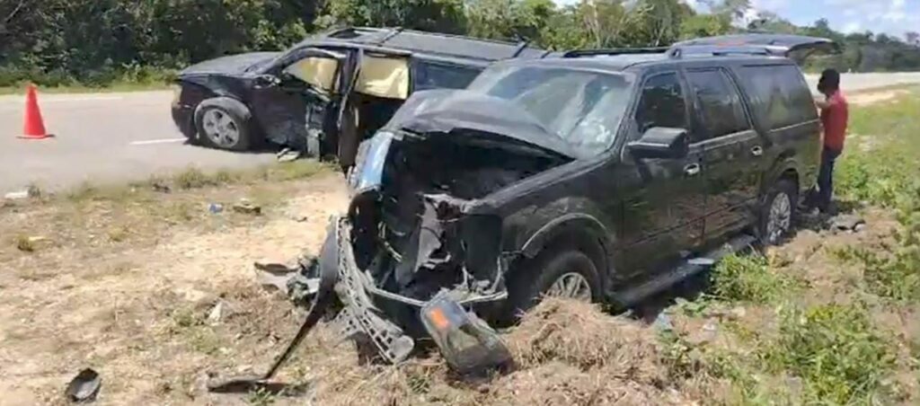 Chetumal.- Fuera del camino y con serios daños materiales terminaron dos camionetas después de chocar de frente, en un tramo de la carretera Bacalar-Miguel Hidalgo.
