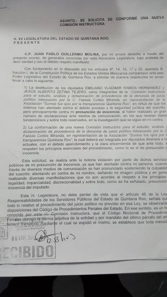 Por otro lado, en un segundo escrito, Guillermo Molina aseguró que a través de distintas declaraciones a la prensa, los diputados Emiliano Ramos Hernández y Jesus Zetina Tejero, integrantes de la comisión instructora que lleva su caso, han vulnerado su presunción de inocencia, por lo que solicitó que sean destituidos de la misma y que otra nueva sea creada.