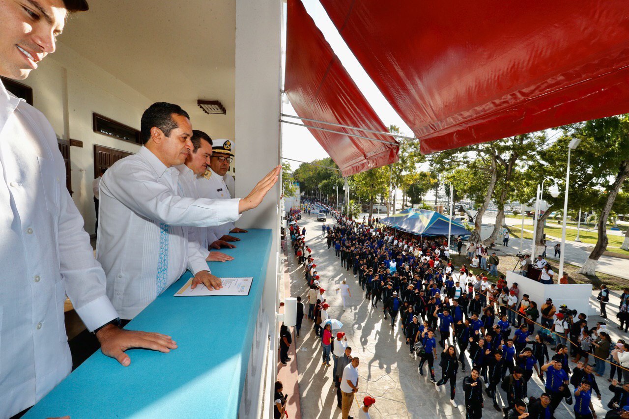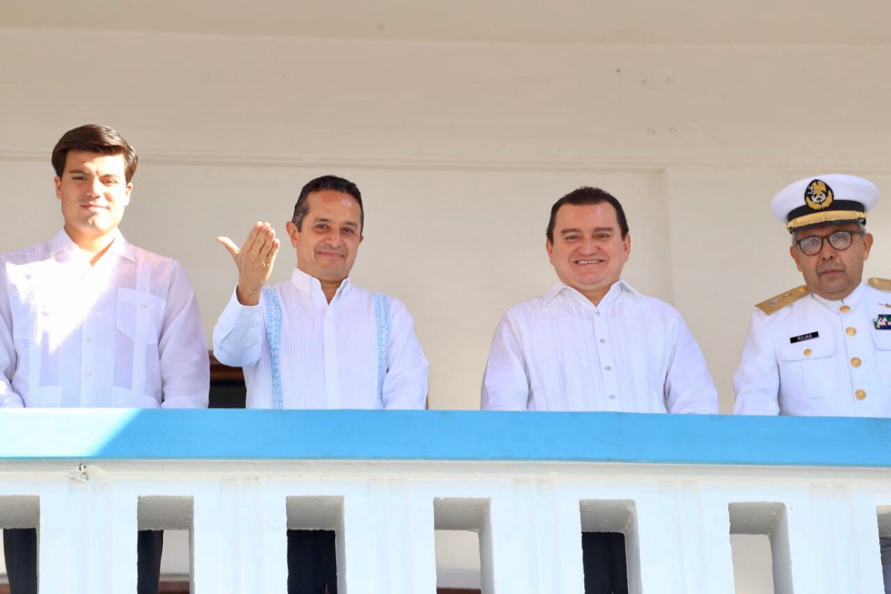 Desde el balcón central, el gobernador Carlos Joaquín presidió el desfile, acompañado por los representantes de los poderes judicial y legislativo, los comandantes de la 34. ª Zona Militar y de la 11. ª Zona Naval y miembros de su gabinete, que en esta ocasión duró dos horas con 39 minutos.