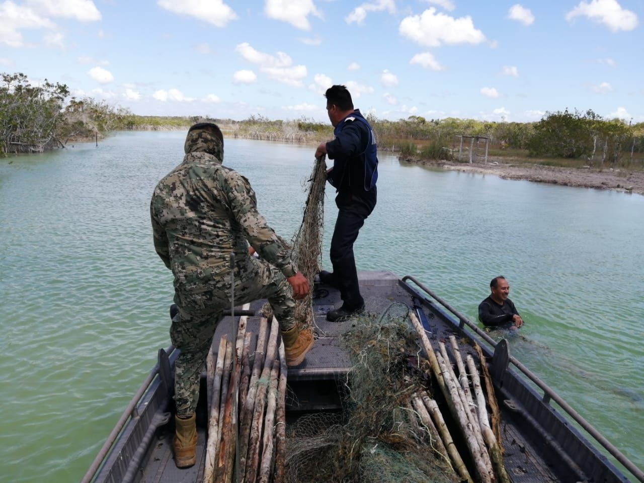 Personal adscrito a la Décimo Primera Zona Naval en funciones de Oficial Federal de Pesca, retiró la red, ubicada en el estero de Chac, municipio de Othón P. Blanco.
