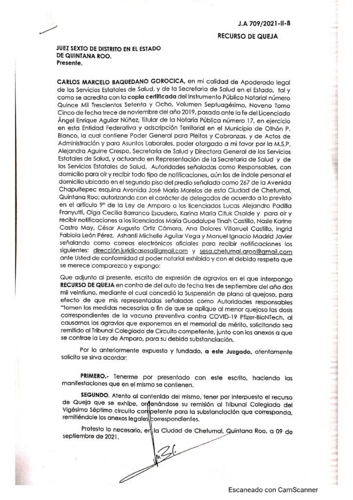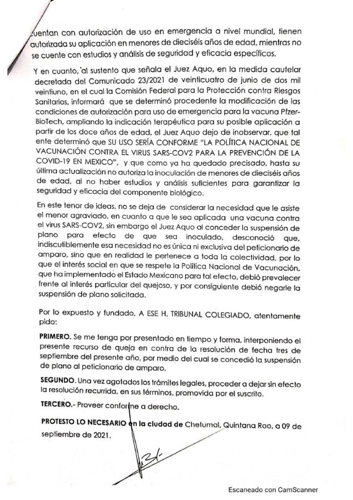 Cabe destacar que esta dependencia quintanarroense es la única en el país que recurrió un amparo otorgado en favor de un menor para ser vacunado contra el COVID-19.
