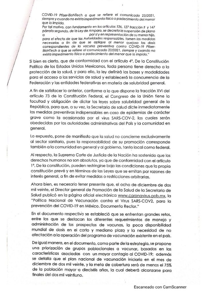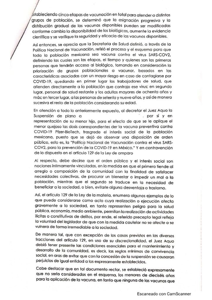 Sin embargo, desmiente este argumento el escrito mismo de la queja, firmado por Carlos Marcelo Baquedano Gorocica, apoderado legal de los Servicios de Salud, en donde se le pide al Tribunal Colegiado rechazar el amparo, alegando que la vacunación de menores todavía no está considerada en el plan nacional de vacunación. En ningún momento se le pide aclarar alguna diferencia de criterios ni se menciona el amparo que fue rechazado por el Juzgado Primero.