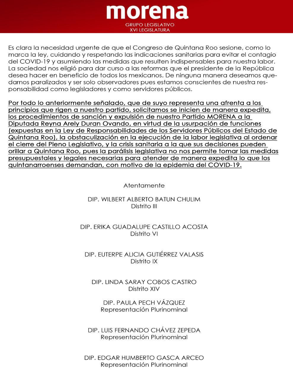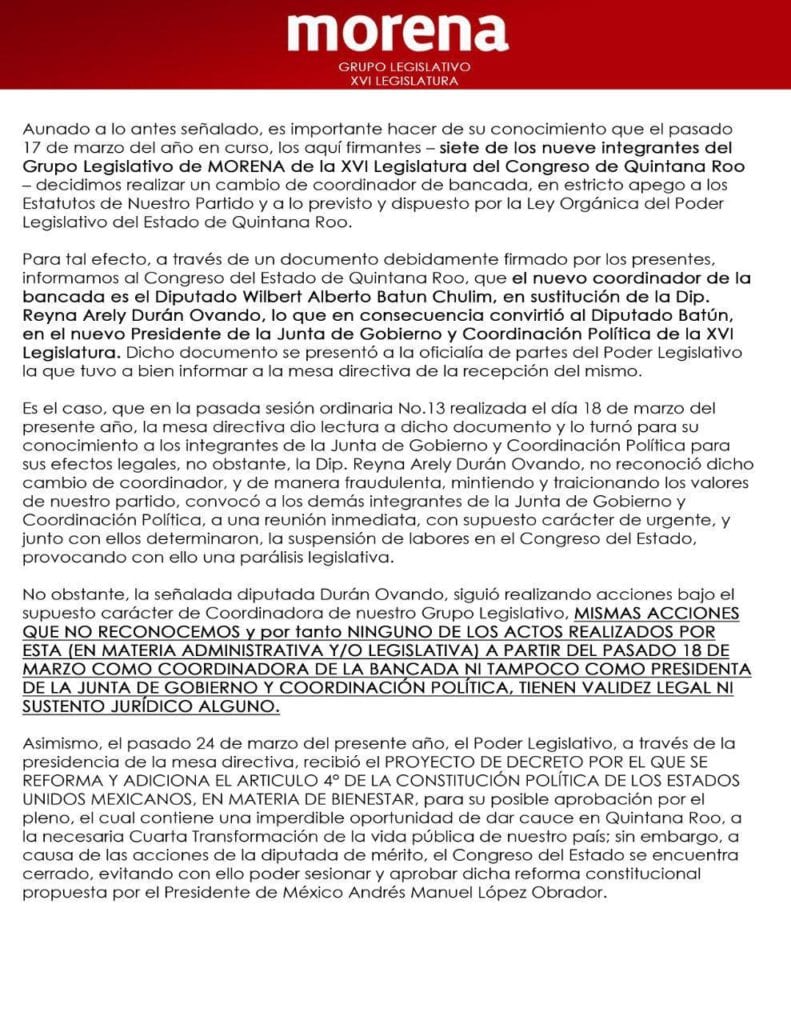 En el oficio, señalan que su coordinador es Batún Chulim y que incluso desconocen todos los actos que Reyna Durán Ovando continúa realizando, ostentándose todavía como coordinadora de Morena y presidenta de la Junta de Gobierno y Coordinación Política.