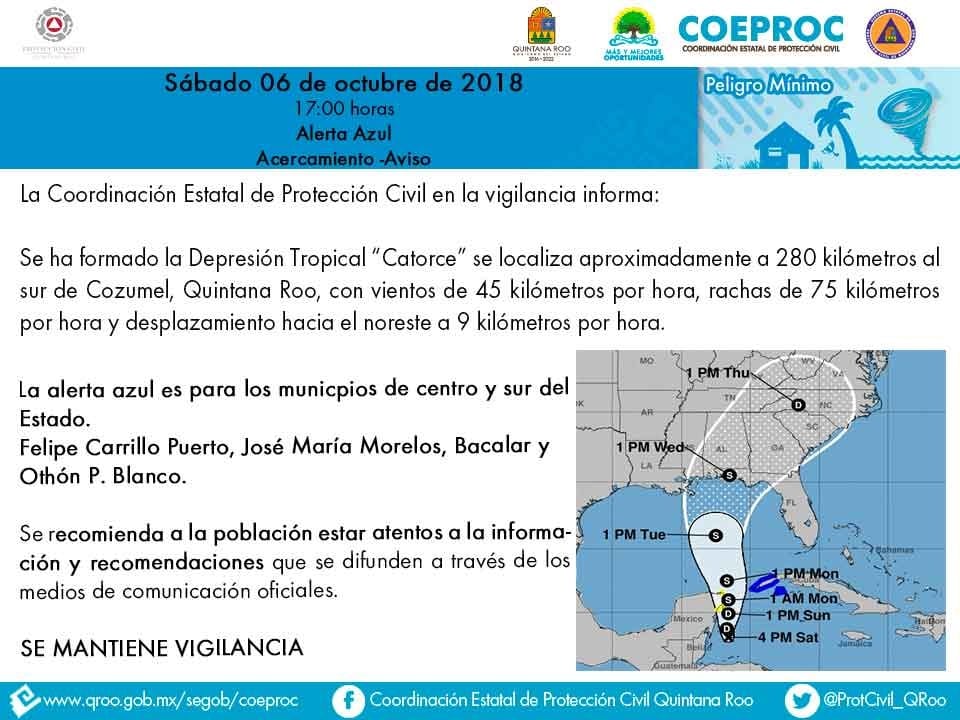 Chetumal.- La Coordinación Estatal de Protección Civil emitió esta tarde alerta azul y verde para municipios del estado debido a la formación de la depresión tropical número 14.