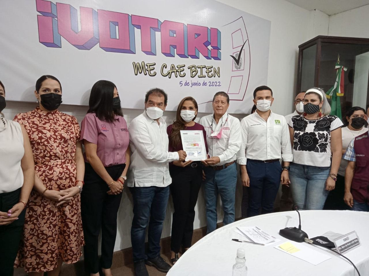 La alianza “Juntos Haremos Historia” de Morena-PVEM-PT-MAS con su candidata Mara Lezama Espinosa fueron los últimos en recibir su constancia, con la edil de Cancún, actualmente con licencia, acompañada por los dirigentes de estos cuatro partido.