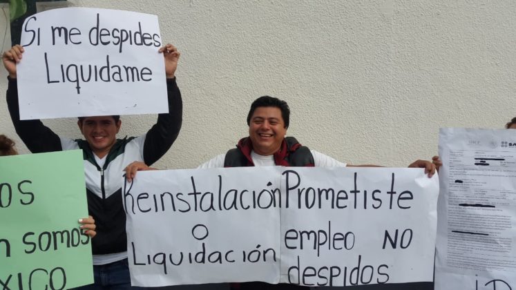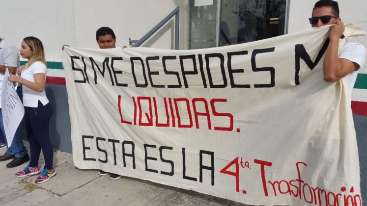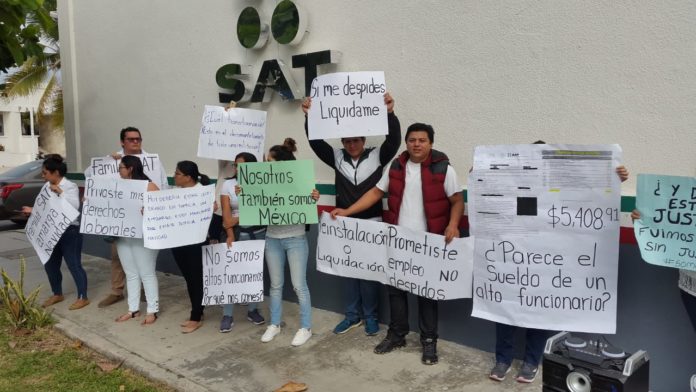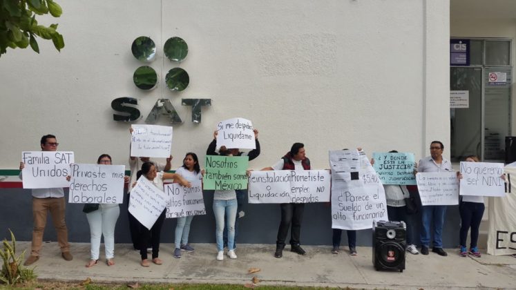 Un grupo de aproximadamente 20 personas protestaba con consignas como “Familia SAT, amarga Navidad”, “No somos ninis, queremos trabajar”, “To voté y me botaste”; mientras que sus lonas y pancartas exhibían que, por ejemplo, algunos ganaban poco más de cinco mil pesos y preguntaban si ese es el sueldo de un alto funcionario, o mensajes como “Si me despides liquídame” o “Prometiste empleos no despidos”, y cuestionando la cuarta transformación.