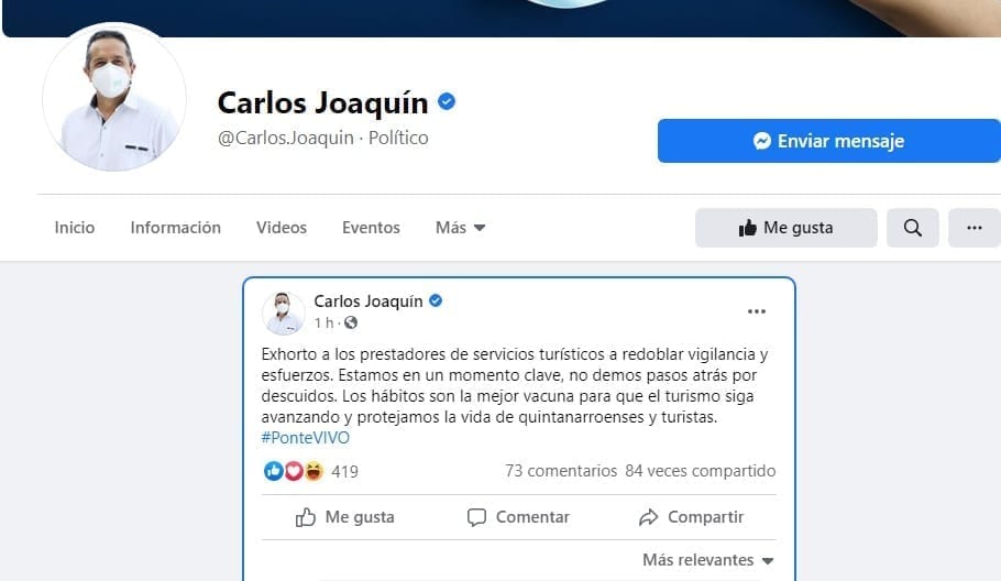 La publicación generó un número importante de ciudadanos quienes coincidieron con el mensaje de Carlos Joaquín con mensajes de respuesta como: “exacto ,debemos cuidarnos nosotros ,por qué la vacunación ,está muy lejos de ser aplicada a toda la población ,gracias gobernador”, apuntó un usuario de la redes.
