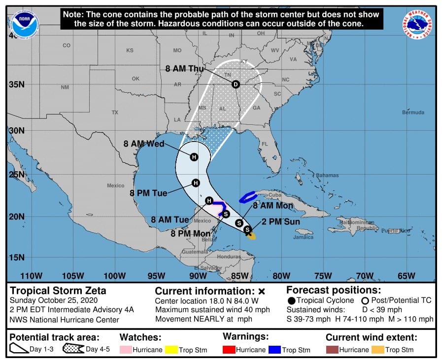 Chetumal.- Desde anoche, la tormenta tropical “Zeta” permanece estacionada a unos 400 kilómetros al sureste, con pronóstico de tocar tierra por Cozumel y luego entre Solidaridad y Benito Juárez en la tarde-noche del lunes, comentó el gobernador Carlos Joaquín González, quien comentó que aunque antes se proyectó que crecería a huracán, ahora parece que continuará en la misma categoría.
