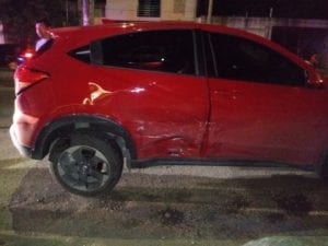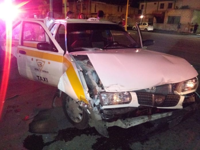 Chetumal.- Un accidente se registró la noche de hoy jueves sobre las avenidas Nicolás Bravo con Maxuxac, cuando el conductor de un auto intentó ganar la luz amarilla del semáforo, por lo cual se impactó contra un taxi.