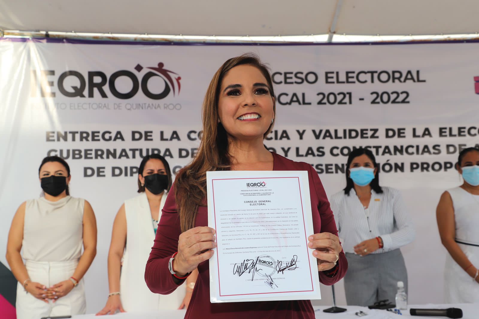 Chetumal, Quintana Roo, 12 de junio. – Estamos haciendo historia porque tenemos a la primera mujer gobernadora, a la primera ciudadana emanada del pueblo, afirmó Mara Lezama al recibir del Instituto Electoral de Quintana Roo (IEQROO) la constancia que la acredita como gobernadora electa.