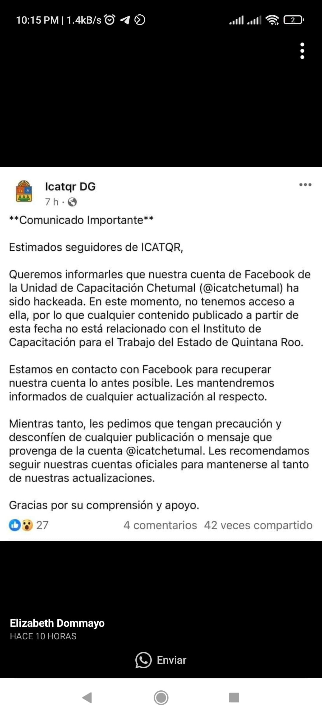 La página oficial de Facebook del Instituto de Capacitación para el Trabajo de Quintana Roo (ICAT) ha sido comprometida por hackers desconocidos. Los atacantes no solo tomaron control de la cuenta, sino que también publicaron contenido inapropiado de naturaleza pornográfica, causando alarma en la comunidad general.