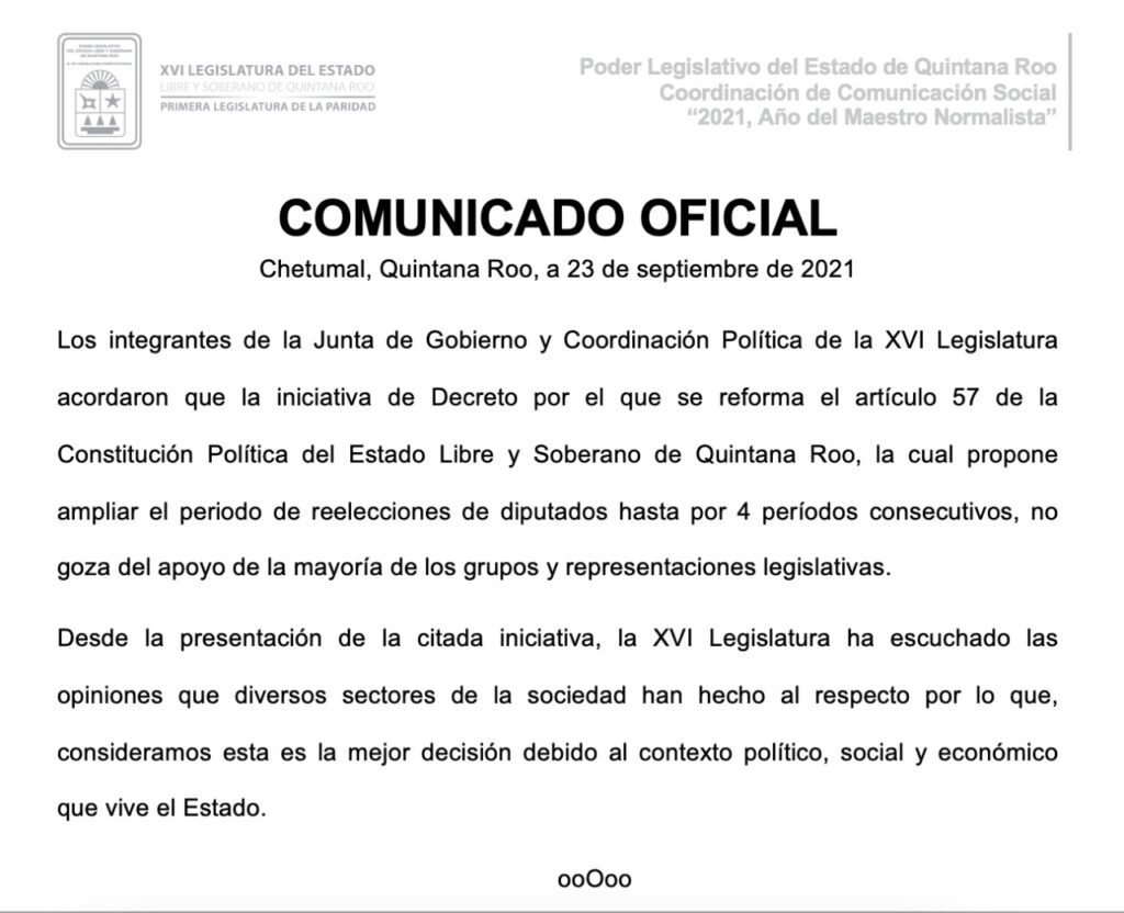 Chetumal.- La Junta de Gobierno y Coordinación Política (Jugocopo) del Congreso del Estado ha informado que la iniciativa para ampliar la posibilidad de reelección de diputados, hasta por tres periodos adicionales consecutivos no goza con el apoyo de la mayoría de los diputados, con lo que se entiende que ha quedado descartado.