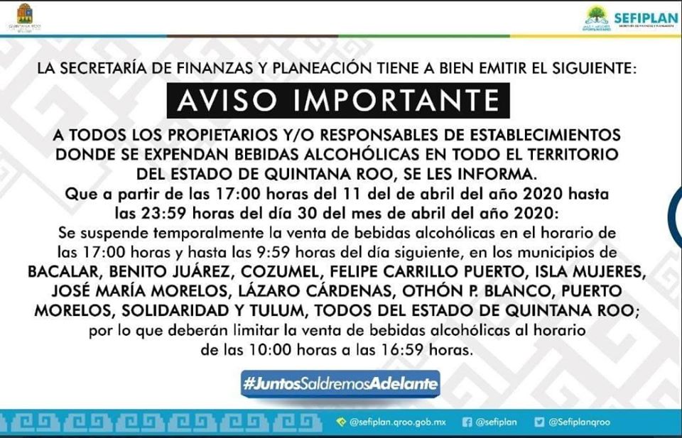 Chetumal.- A través de un comunicado, la Secretaría de Finanzas y Planeación (Sefiplan), anunció que a partir de mañana sábado 11 de abril y hasta el 30 del mismo mes, la venta de alcohol será suspendida temporalmente.